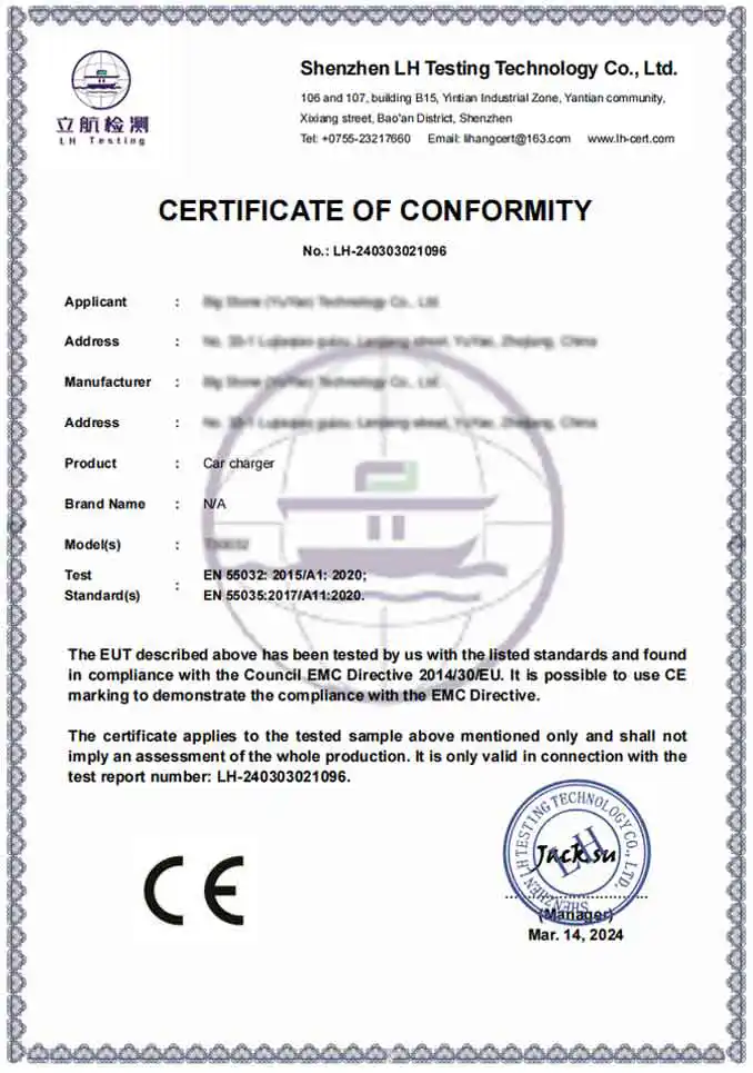 P: Quais certificações de segurança seus produtos de carregamento possuem para exportação internacional?
