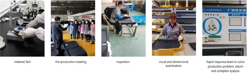 Estamos totalmente em conformidade com a ISO9001 para o design e fabricação de tapetes automotivos, ISO/TSI16949 para controle de qualidade, ISO14001:2015 para gestão ambiental, BSCI para responsabilidade social e padrões REACH da UE para matérias-primas. Temos instalações de teste internas para realizar autoverificações para garantir que nossos produtos passem nos testes realizados pela SGS, Intertek ou qualquer outro inspetor terceirizado que os clientes possam exigir.