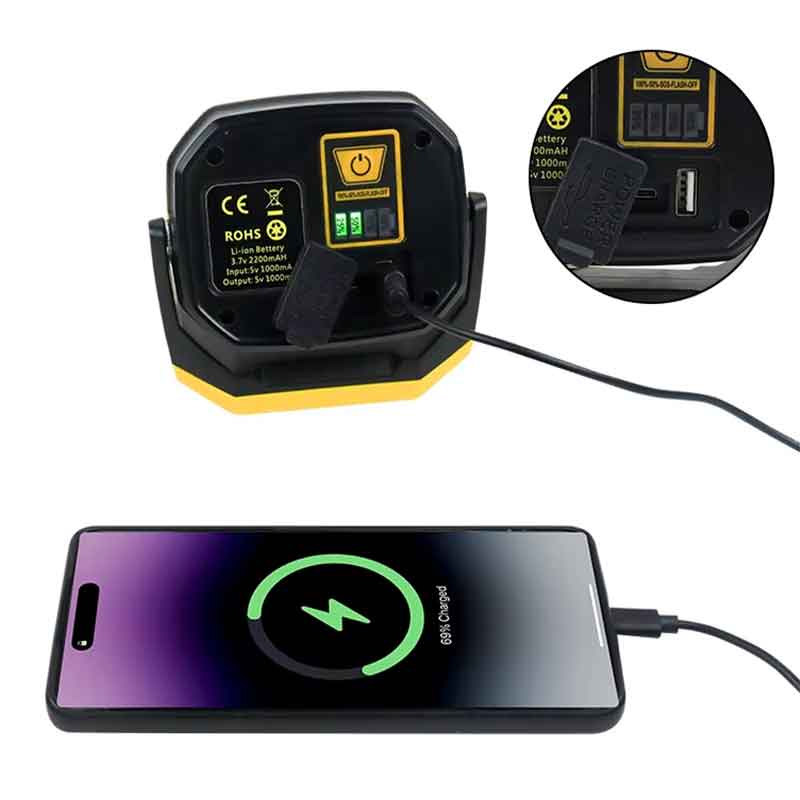 R: Sim. A porta USB-C suporta entrada (carregamento da luz de trabalho) e saída (atuando como banco de energia para carregar dispositivos móveis).