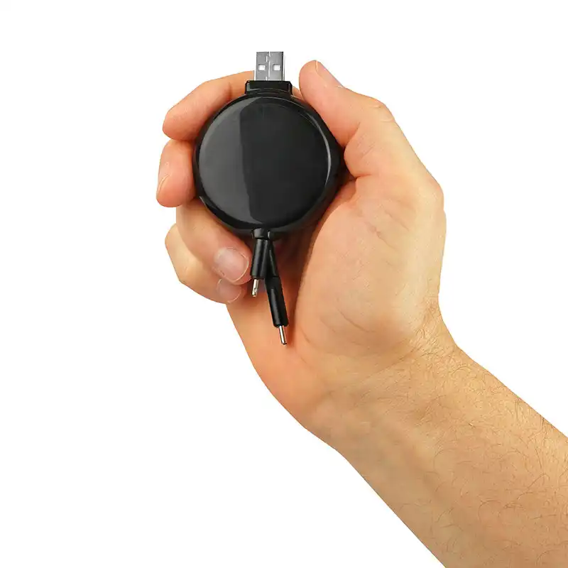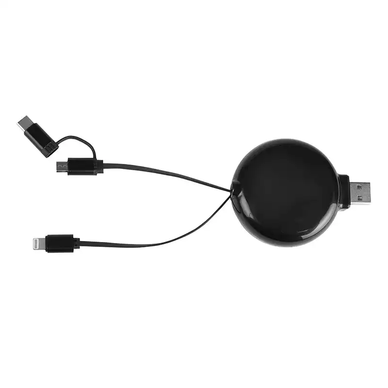 Uma solução 3 em 1 versátil com conectores Lightning, Micro-USB e USB-C integrados em um único carretel retrátil para máxima compatibilidade.